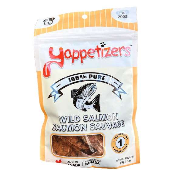 Yappetizers salmon and blueberries dog treats are made from 100% wild salmon and blueberries. This all-natural pure salmon dog treat infused with blueberries contains no additives, preservatives or unnecessary fillers.