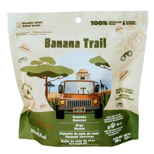Les friandises sont fabriquées à la main en petits lots et déshydratées pour conserver leur couleur naturelle. Fabriquées avec des ingrédients de qualité alimentaire : purée de bananes, farine d'orge, assaisonnement (copeaux de noix de coco, huile de noix de coco).